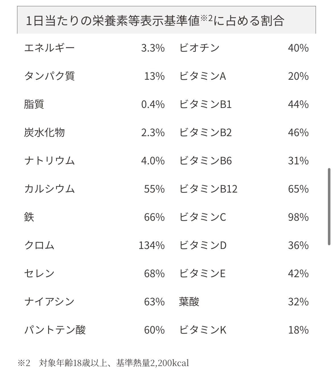 カルシウム、鉄、ナイアシン、パントテン酸、ビオチン、ビタミンB1、B2、B6、B12、C、D、葉酸などなど、
